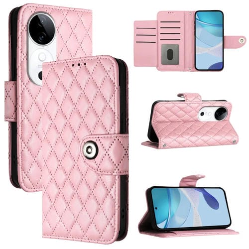 Funda de Cuero con Tapa y Textura Rombal para Teléfono Vivo S19 con Cordón (Rosa)