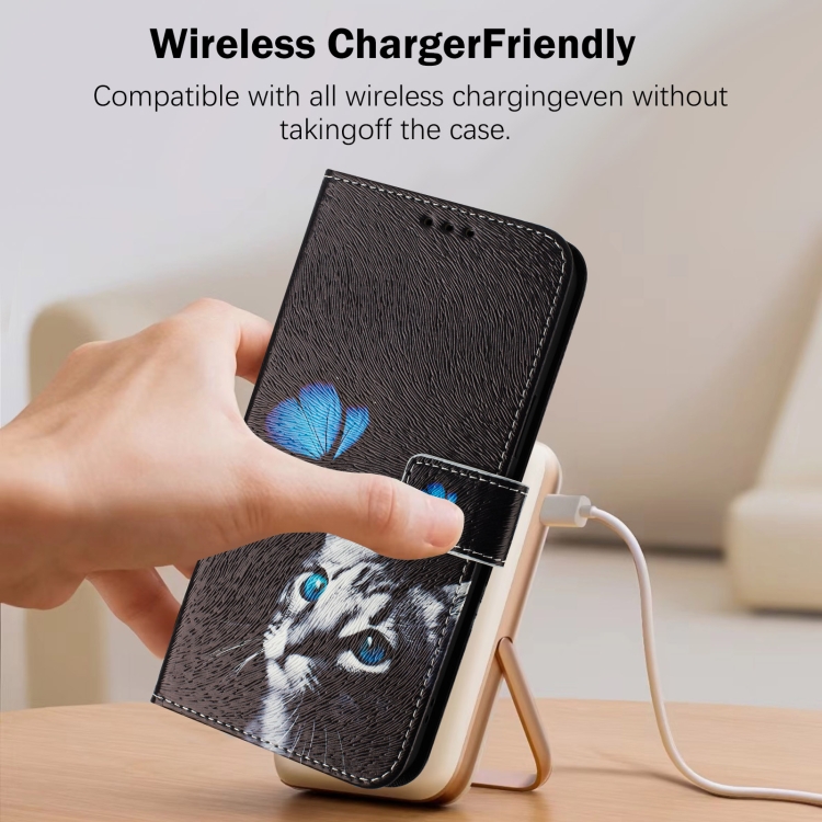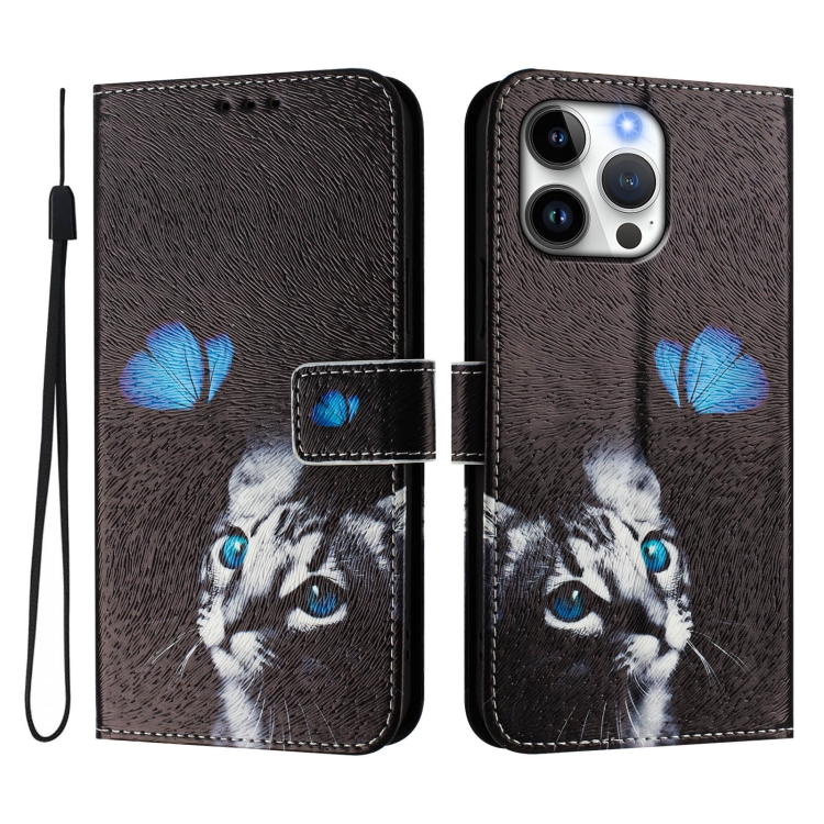 Funda de Cuero para iPhone 16 Pro con Diseño Dibujo Artístico (Gato Mariposa)