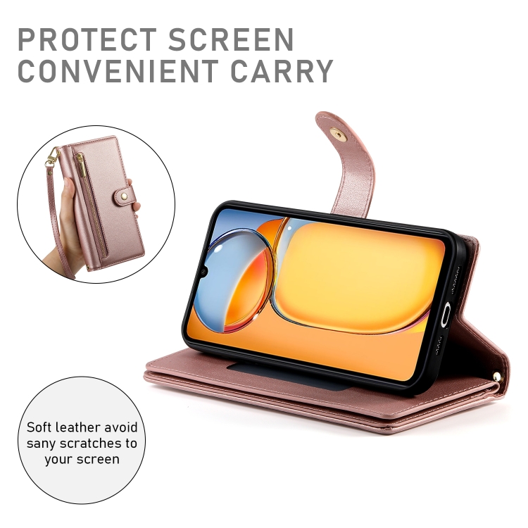 Funda de Cuero para Teléfono con Nueve Ranuras para Tarjetas y Cremallera para Redmi 13C 5G/4G/Xiaomi Poco C65 (Rosa)