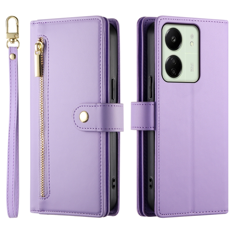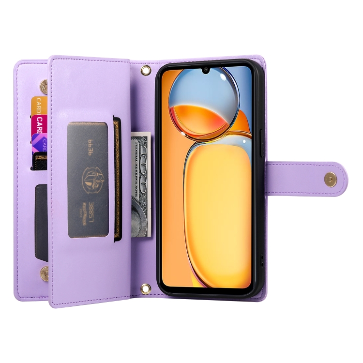 Funda de Cuero para Teléfono con Nueve Ranuras para Tarjetas y Cremallera para Redmi 13R/Xiaomi Poco M6 (Morado)