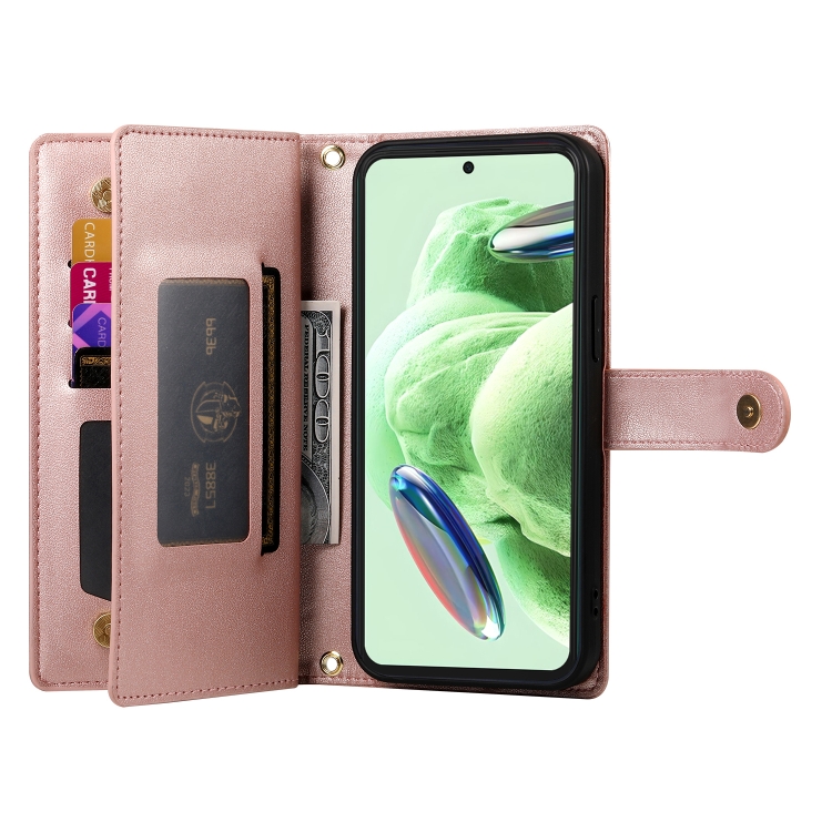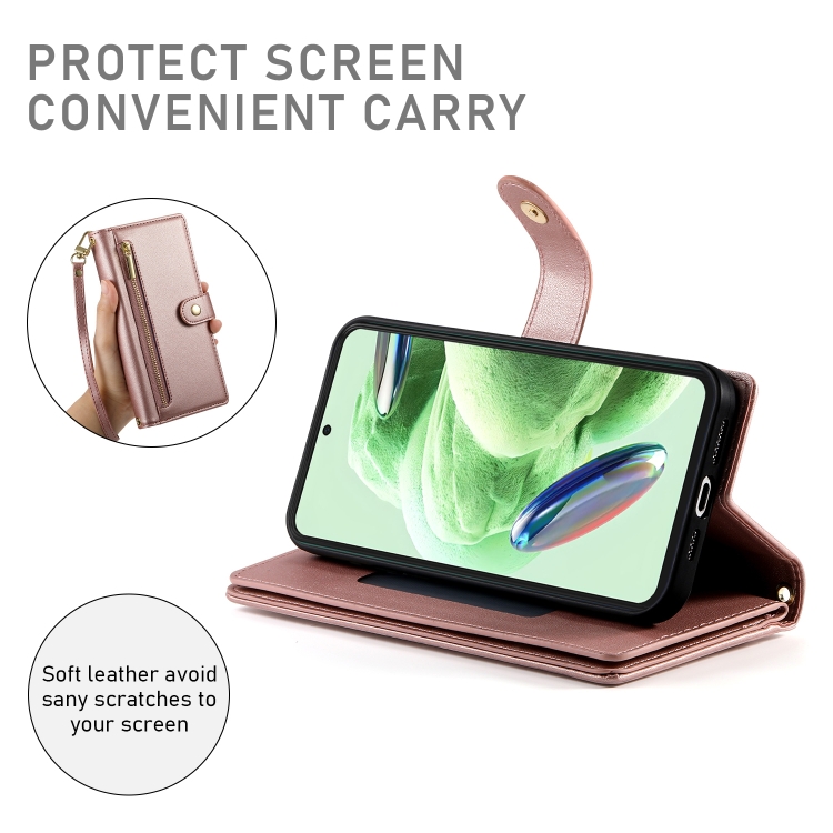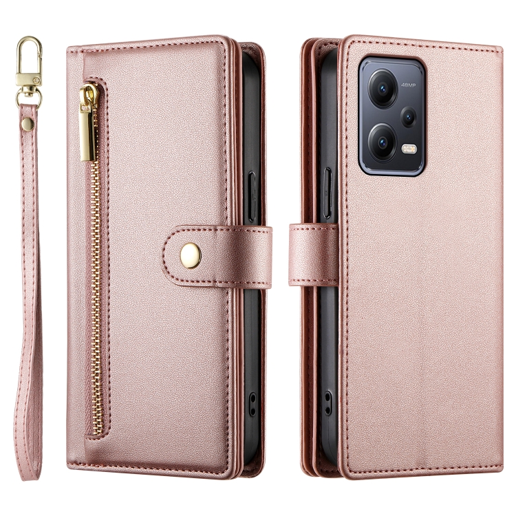 Funda de Cuero para Teléfono con Nueve Ranuras para Tarjetas y Cremallera para Redmi Note 12 5G/Xiaomi Poco X5 (Rosa)