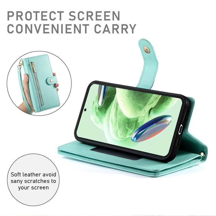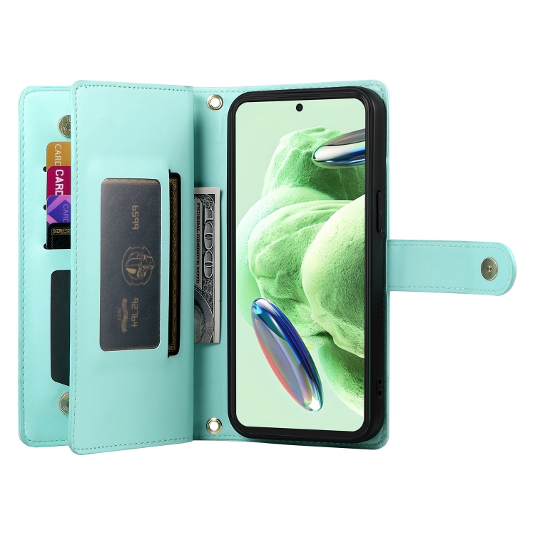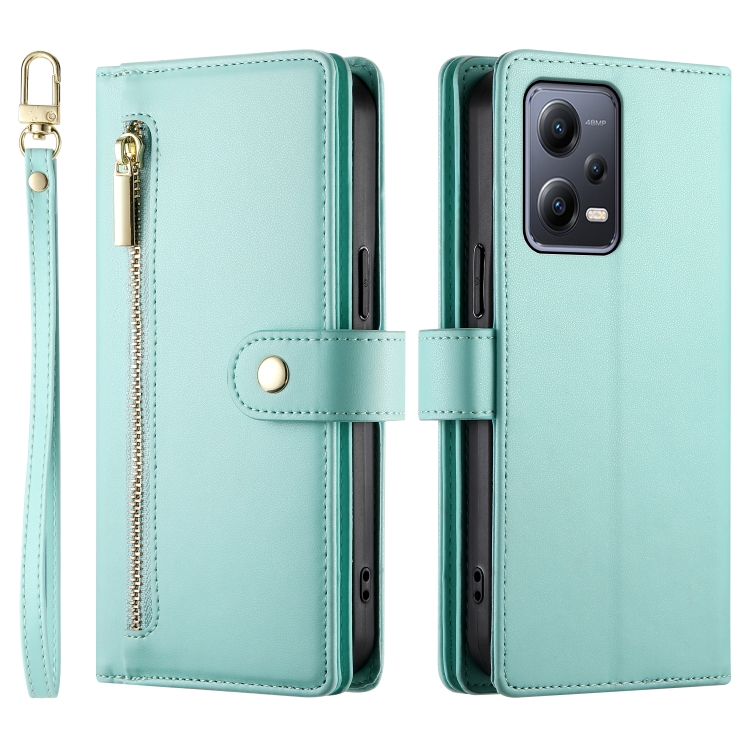 Funda de Cuero para Teléfono con Nueve Ranuras para Tarjetas y Cremallera para Redmi Note 12 5G/Xiaomi Poco X5 (Verde Menta)