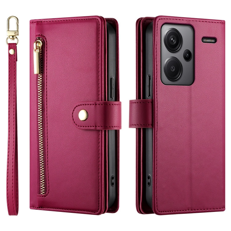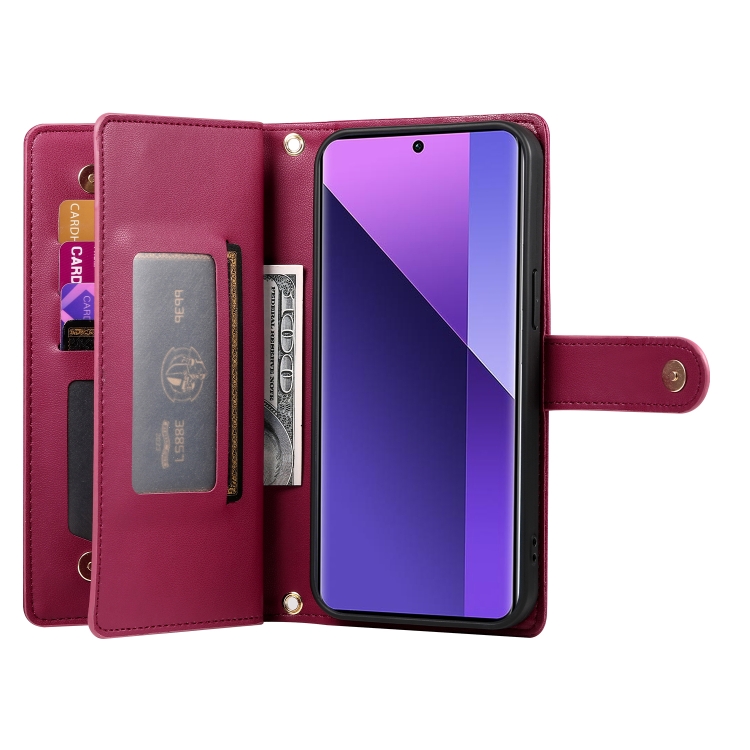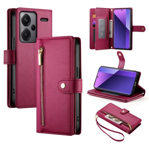 Funda de Cuero para Teléfono con Nueve Ranuras para Tarjetas y Cremallera para Redmi Note 13 Pro+ (Rojo)