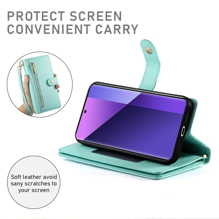 Funda de Cuero para Teléfono con Nueve Ranuras para Tarjetas y Cremallera para Redmi Note 13 Pro+ (Verde Menta)