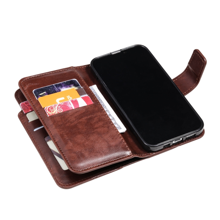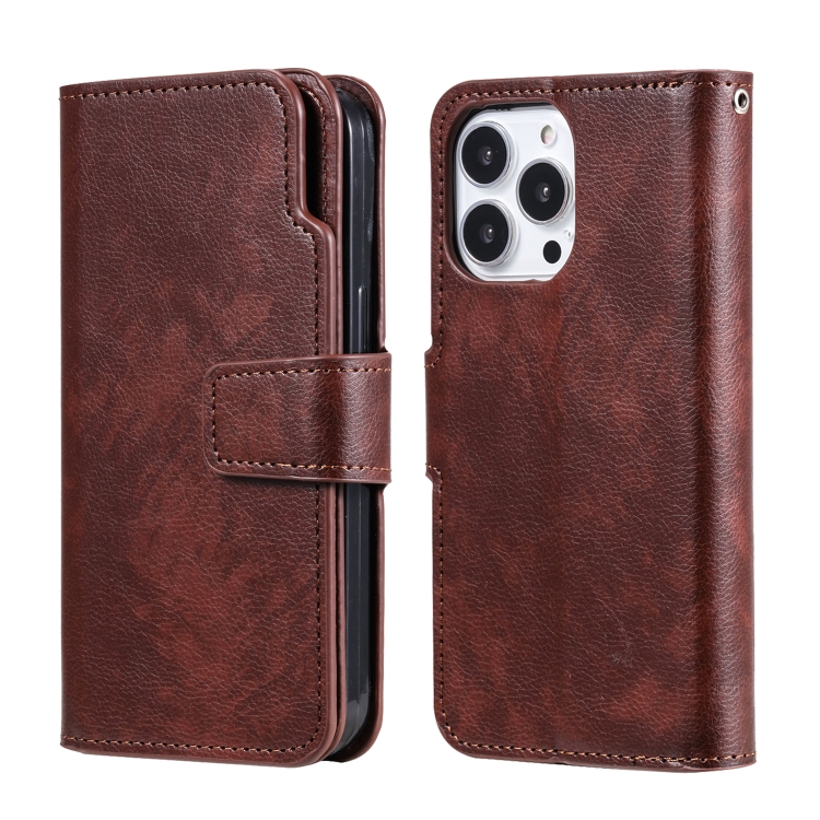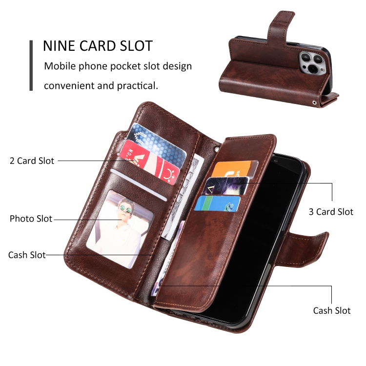 Funda para Teléfono Cuero iPhone 16 Pro Max Tres Pliegues Capacidad 9 Tarjetas (Marrón)