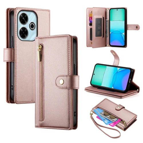 Funda de Cuero para Teléfono Redmi 13 con Nueve Ranuras para Tarjetas y Cremallera (Rosa)