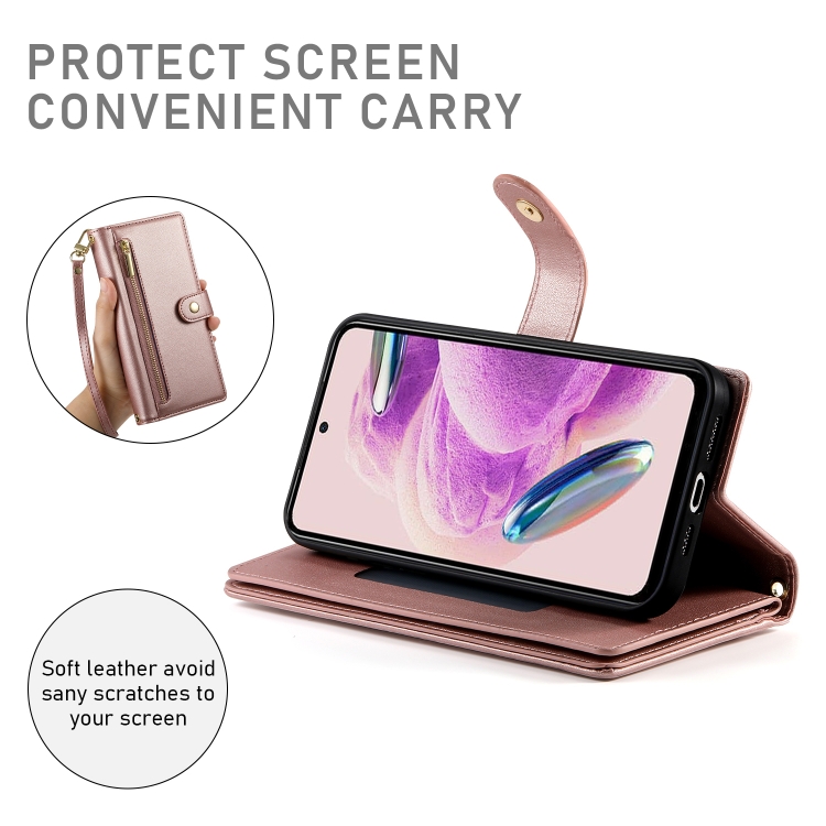 Funda de Cuero para Teléfono Redmi Note 11S 4G con Nueve Ranuras para Tarjetas y Cremallera (Rosa)