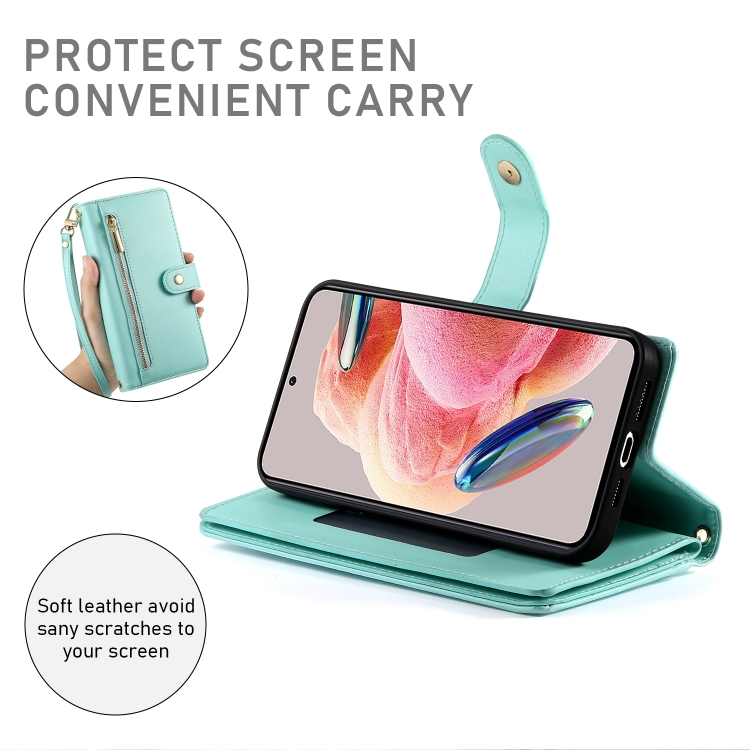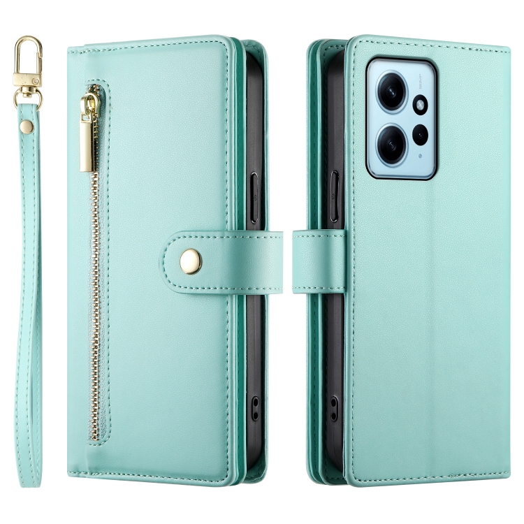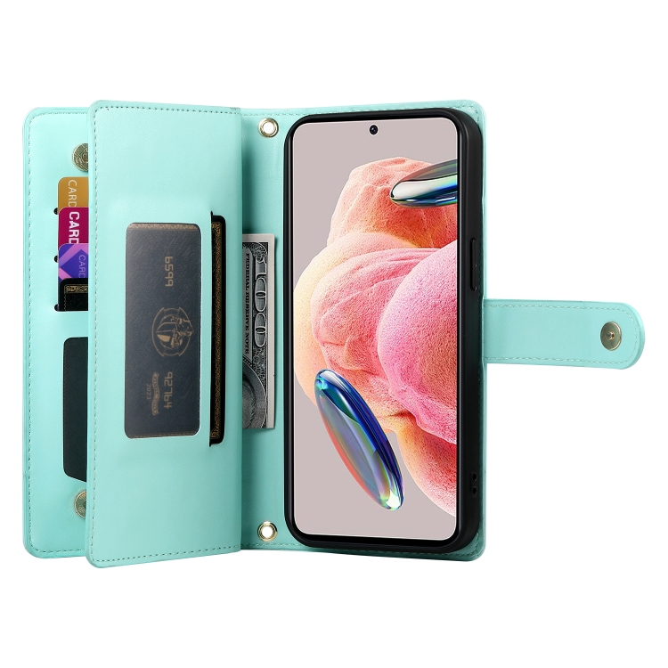 Funda de Cuero para Teléfono Redmi Note 12 4G/Note 12R Pro con Nueve Ranuras para Tarjetas y Cremallera (Verde Menta)