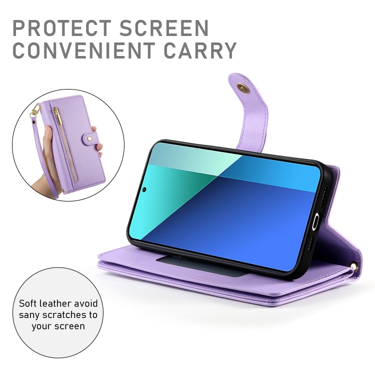 Funda de Cuero para Teléfono Redmi Note 13 4G con Nueve Ranuras para Tarjetas y Cremallera (Morado)