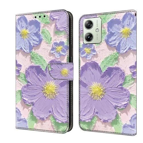 Funda de Cuero Pintada a Mano Motorola Moto G54 con Pintura al Óleo Flores Moradas