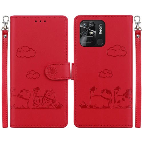 Funda de Cuero Rfid con Diseño de Gatos para Redmi 10C (Roja)