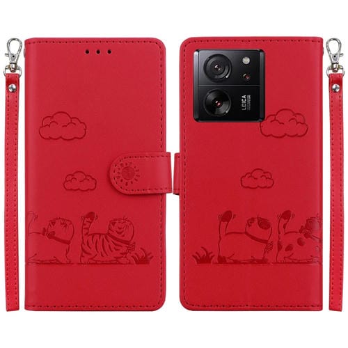 Funda de Cuero Rfid con Diseño de Gatos para Xiaomi 13T/13T Pro (Roja)