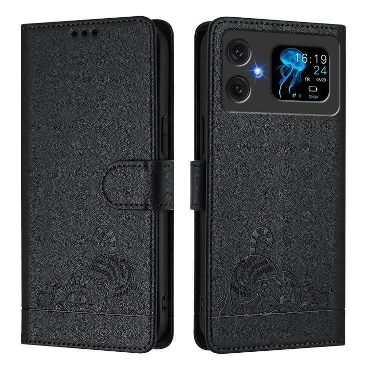 Funda de Cuero Rfid para Cubot A20 con Cordón Estampado Rata y Gato En Relieve (Negro)