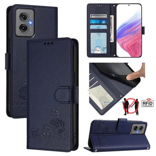 Funda de Cuero Rfid para Motorola Moto G55 con Estampado de Rata y Gato en Relieve y Cordón (Azul)