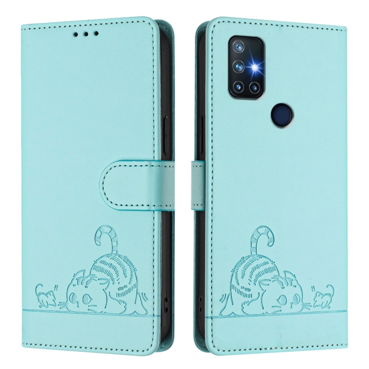 Funda de Cuero Rfid para OnePlus Nord N10 5G con Estampado de Rata y Gato en Relieve y Cordón (Verde Menta)