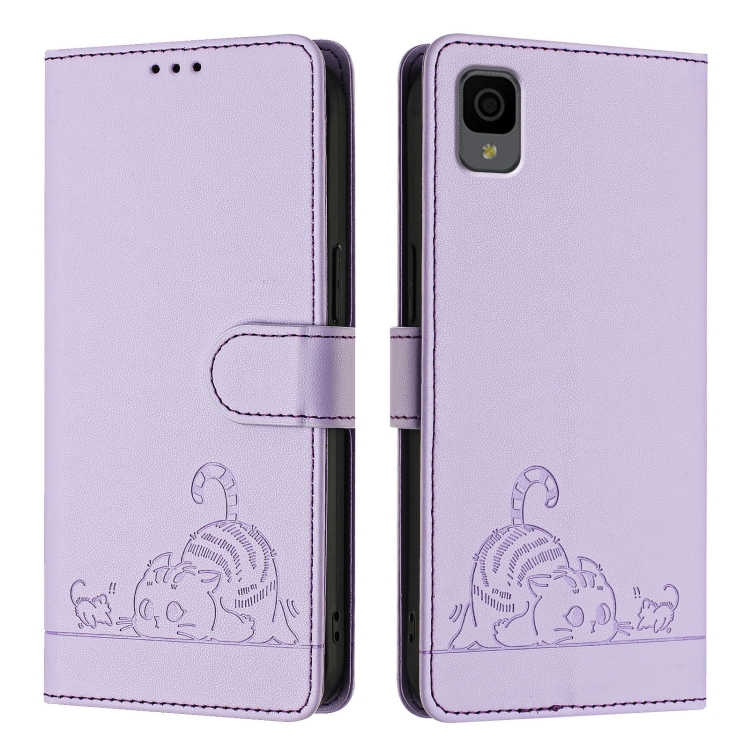 Funda de Cuero Rfid para TCL 30Z T602Dl con Estampado de Rata y Gato y Cordón (Morado)