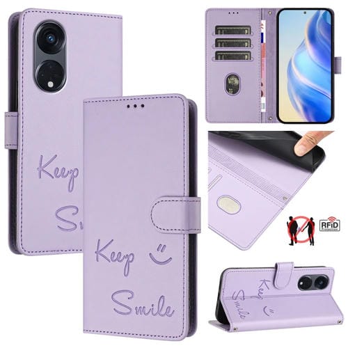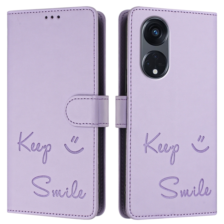 Funda de Cuero Rfid con Relieve de Sonrisa Global para Oppo A1 Pro 5G/Reno8 T 5G (Morado Claro)