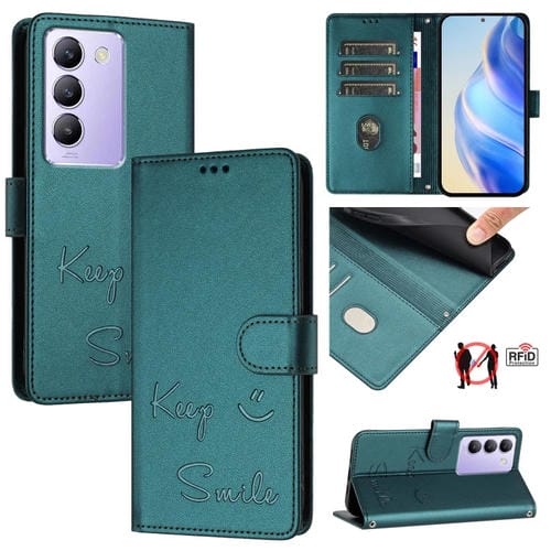 Funda de Cuero Rfid con Relieve de Sonrisa Global para Vivo Y200E 5G (Verde Pavo Real)