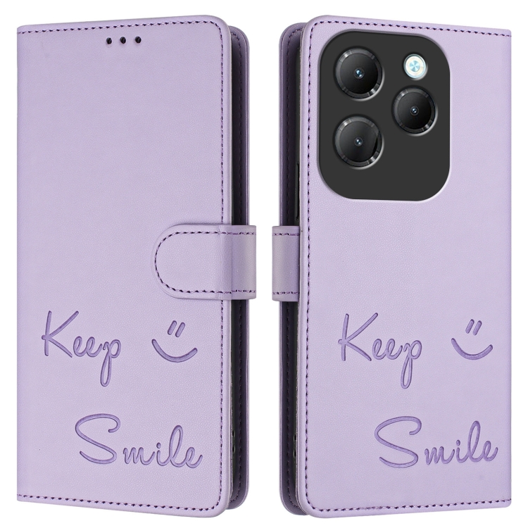 Funda de Cuero Rfid con Relieve Sonriente para Infinix Hot 40 y Hot 40 Pro (Morado Claro)