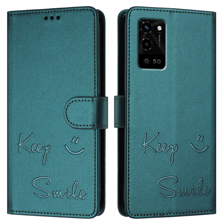 Funda de Cuero Rfid con Relieve Sonriente para Oppo A54 4G/A54S/A55 5G (Verde Pavo Real)