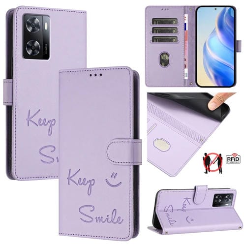 Funda de Cuero Rfid con Relieve Sonriente para Oppo A57 4G / A57S 4G / A57E 4G (Morado Claro)