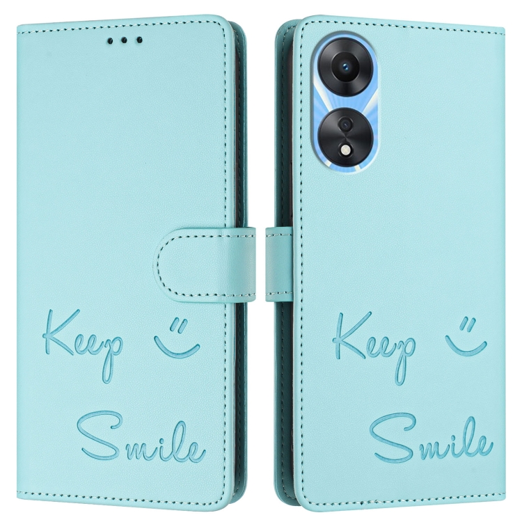 Funda de Cuero Rfid con Relieve Sonriente para Oppo A78 5G Global/A1X 5G (Verde Menta)