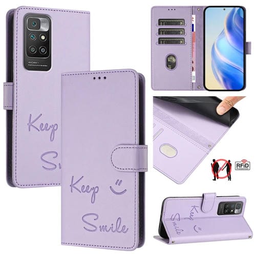 Funda de Cuero Rfid con Relieve Sonriente para Redmi 10 / Redmi 10 2022 (Morado Claro)