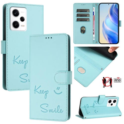 Funda de Cuero Rfid con Relieve Sonriente para Redmi Note 12 Pro 5G Global/India (Verde Menta)