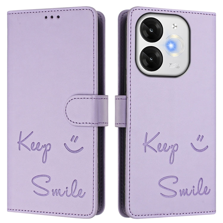 Funda de Cuero Rfid con Relieve Sonriente para Teléfono Itel A80 4G (Morado Claro)
