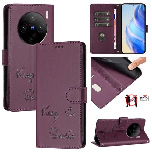 Funda de Cuero Rfid con Relieve Sonriente para Vivo X100 Pro 5G (Violeta)