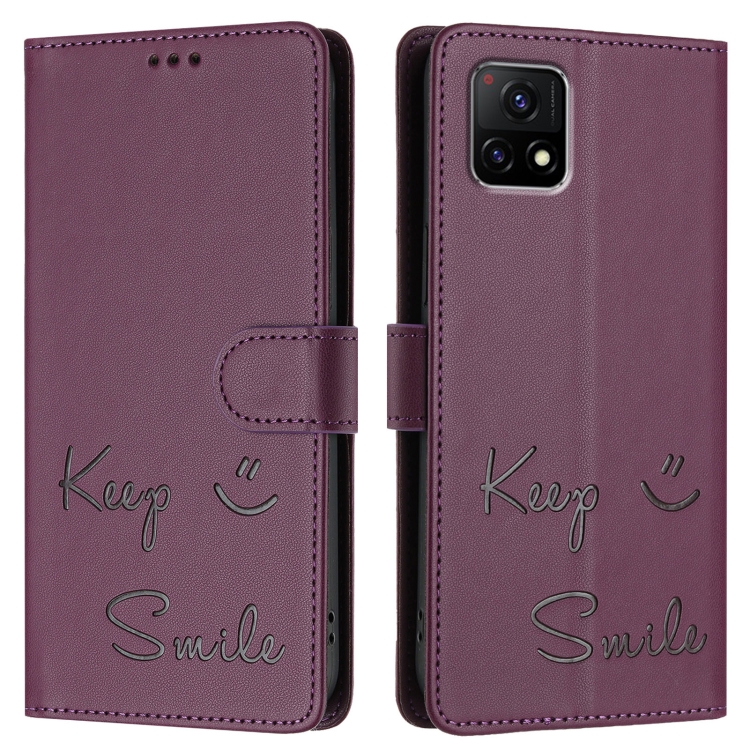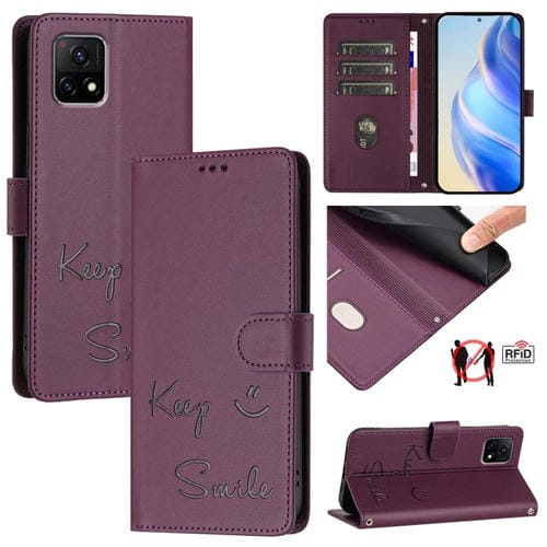 Funda de Cuero Rfid con Relieve Sonriente para Vivo Y52S 5G/Iqoo U3 (Violeta)