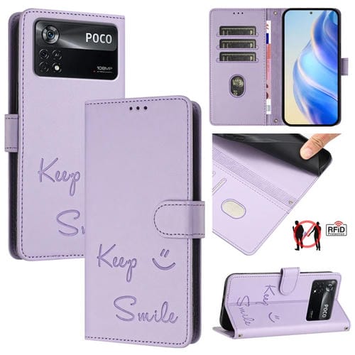 Funda de Cuero Rfid con Relieve Sonriente para Xiaomi Poco X4 Pro 5G (Morado Claro)