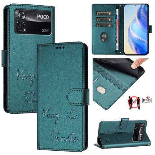 Funda de Cuero Rfid con Relieve Sonriente para Xiaomi Poco X4 Pro 5G (Verde Pavo Real)