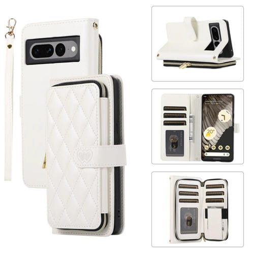 Funda de Cuero Tipo Billetera con Cremallera Completa y Diseño Rombal para Google Pixel 7 Pro (Blanca)