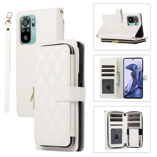 Funda de Cuero Tipo Billetera con Cremallera Completa y Diseño Rombal para Redmi Note 10/10S (Blanca)