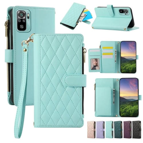 Funda de Cuero Tipo Billetera con Cremallera Rombal para Redmi Note 10/10S (Cian)
