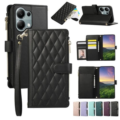 Funda de Cuero Tipo Billetera con Cremallera Rombal para Redmi Note 13 Pro 4G (Negra)
