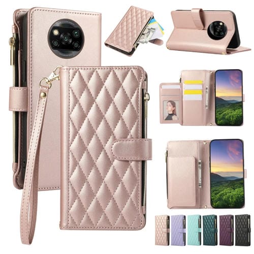 Funda de Cuero Tipo Billetera con Cremallera Rombal para Xiaomi Poco X3 Nfc (Oro Rosa)