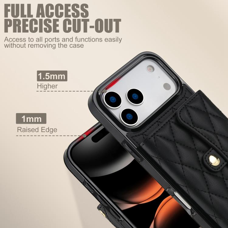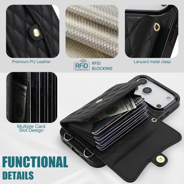 Funda de cuero tipo cartera horizontal con diseño rómbico cruzado para iPhone 17 Pro Max (negra)