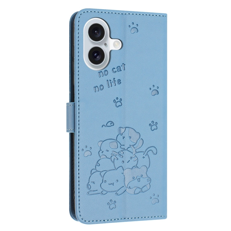 Funda de Piel para iPhone 16 Diseño de Gatito En Relieve con Cordón (Azul)