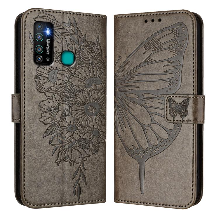 Funda de Piel para Tecno Camon 15 con Diseño de Mariposa en Relieve (Gris)