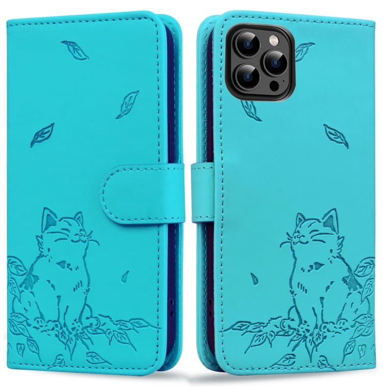 Funda de Piel iPhone 16 Pro Max Estampado de Gato (Azul Lago)