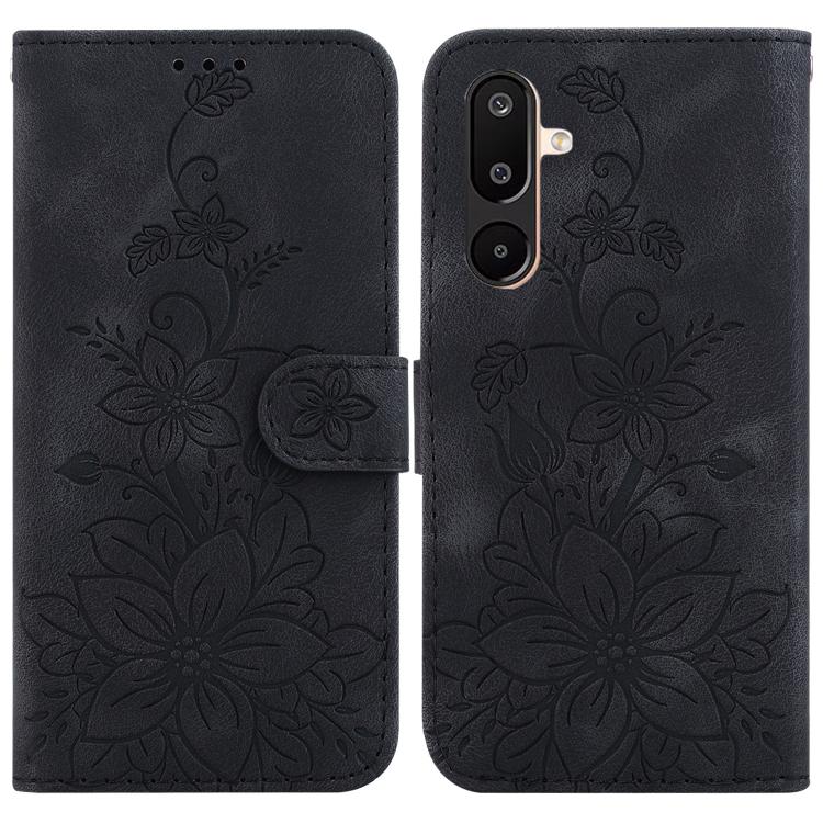 Funda de piel con relieve de lirio para Samsung Galaxy M16 5G / F16 5G / M36 5G (negra)