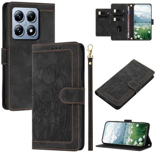 Funda De Piel Con Relieve De Tulipanes Para Xiaomi 14T Con Cordón (Negro)
