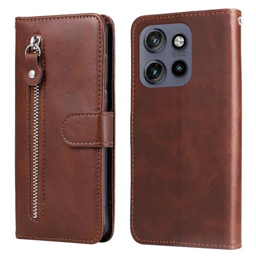 Funda de Piel con Textura de Becerro y Cremallera para Motorola Edge 50 Neo/Thinkphone 25 (Marrón)