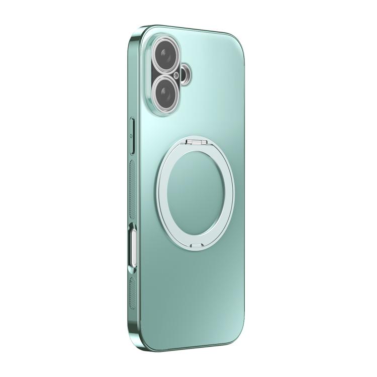 Funda MagSafe electrochapada para iPhone 17 con soporte giratorio de 360 grados y cubierta para lente (verde claro).