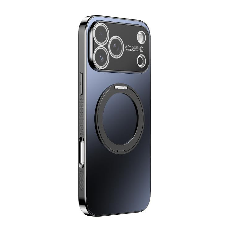 Funda MagSafe electrochapada para iPhone 17 Pro Max con soporte giratorio de 360 grados y cubierta para lente (negra).