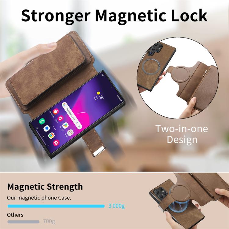 Funda Neo MagSafe RFID antirrobo con cremallera para Samsung Galaxy S25 Ultra 5G, estilo billetera de cuero retro (marrón)
