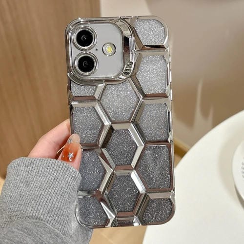 Funda para iPhone 16 Grabado Láser Galvanoplastia Purpurina Panal 3D (Plateada)