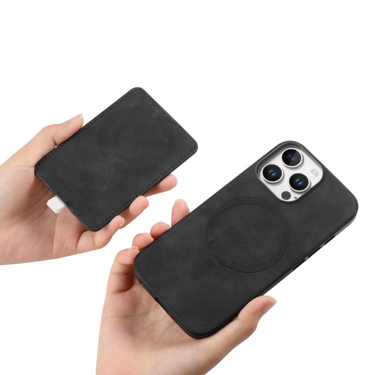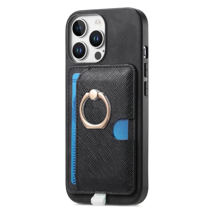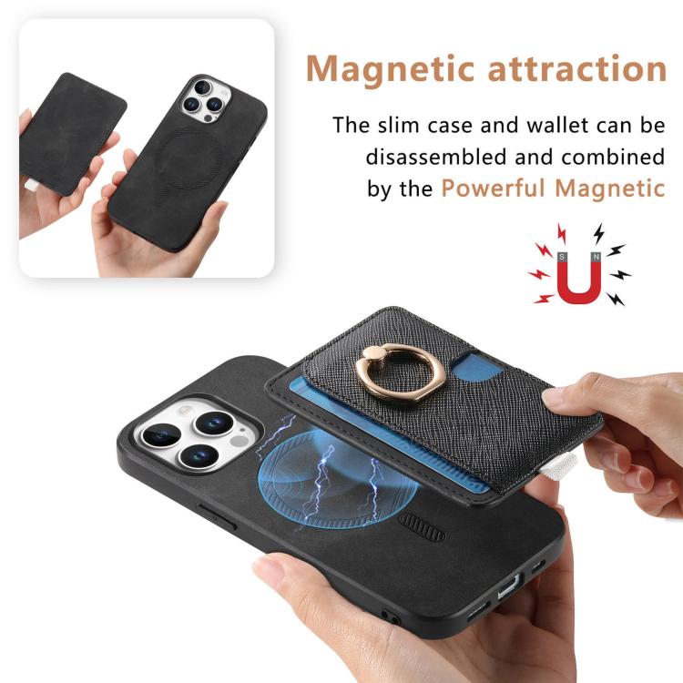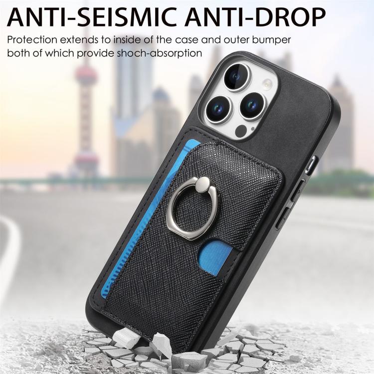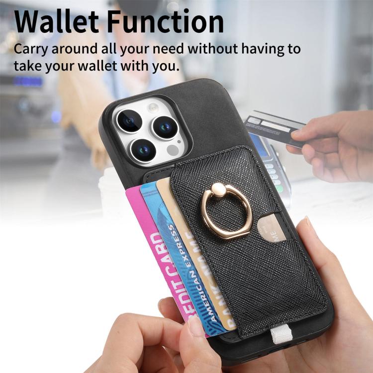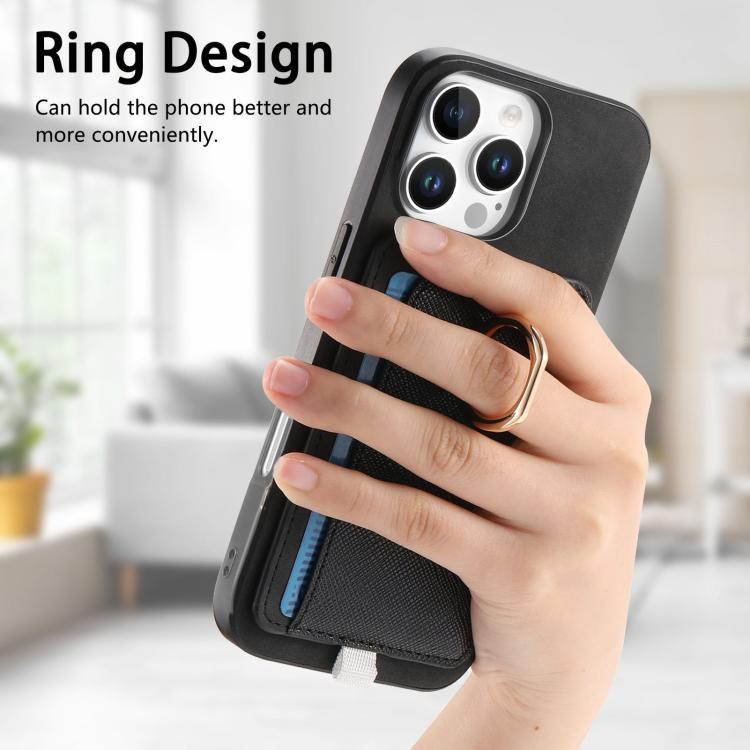 Funda para iPhone 16 Pro Max Cuero Ranuras para Tarjetas Anillo Diseño Retro (Negro)